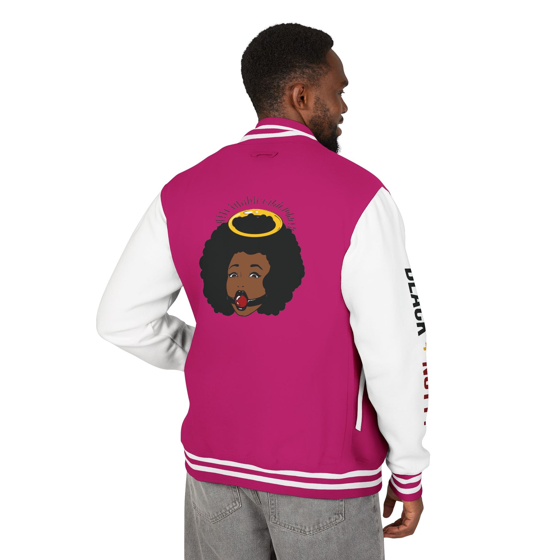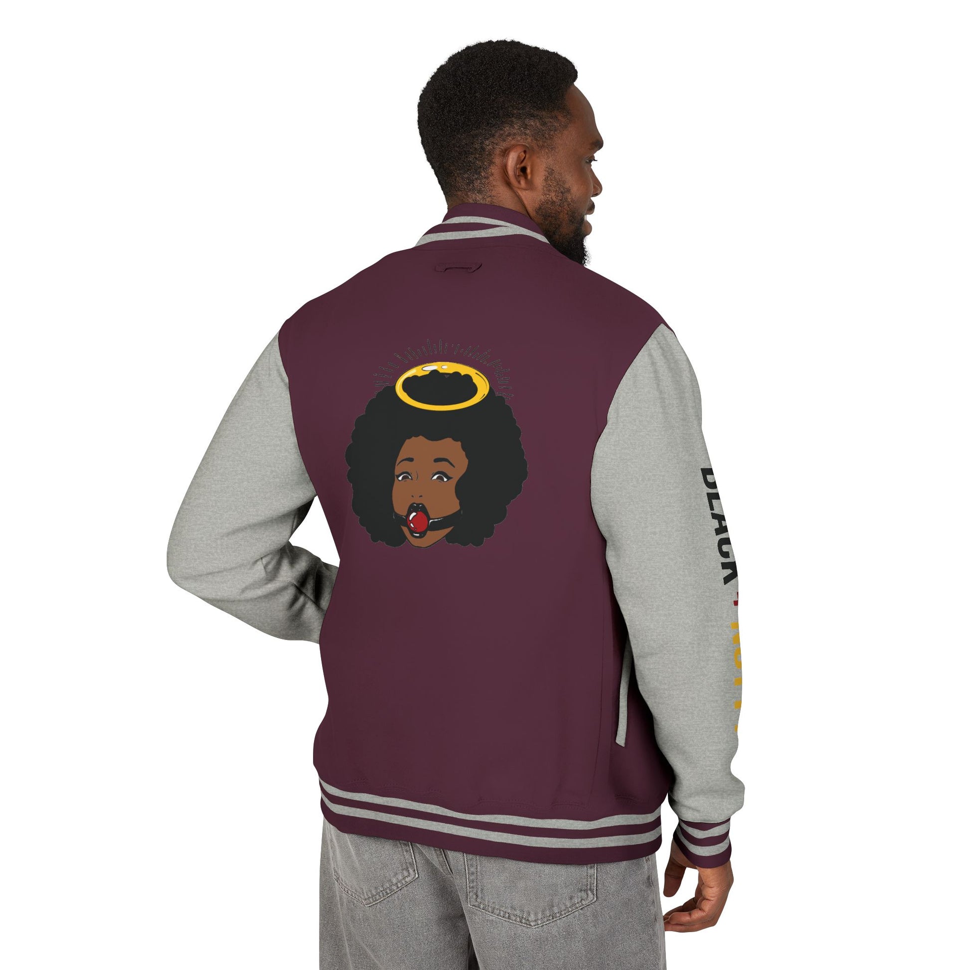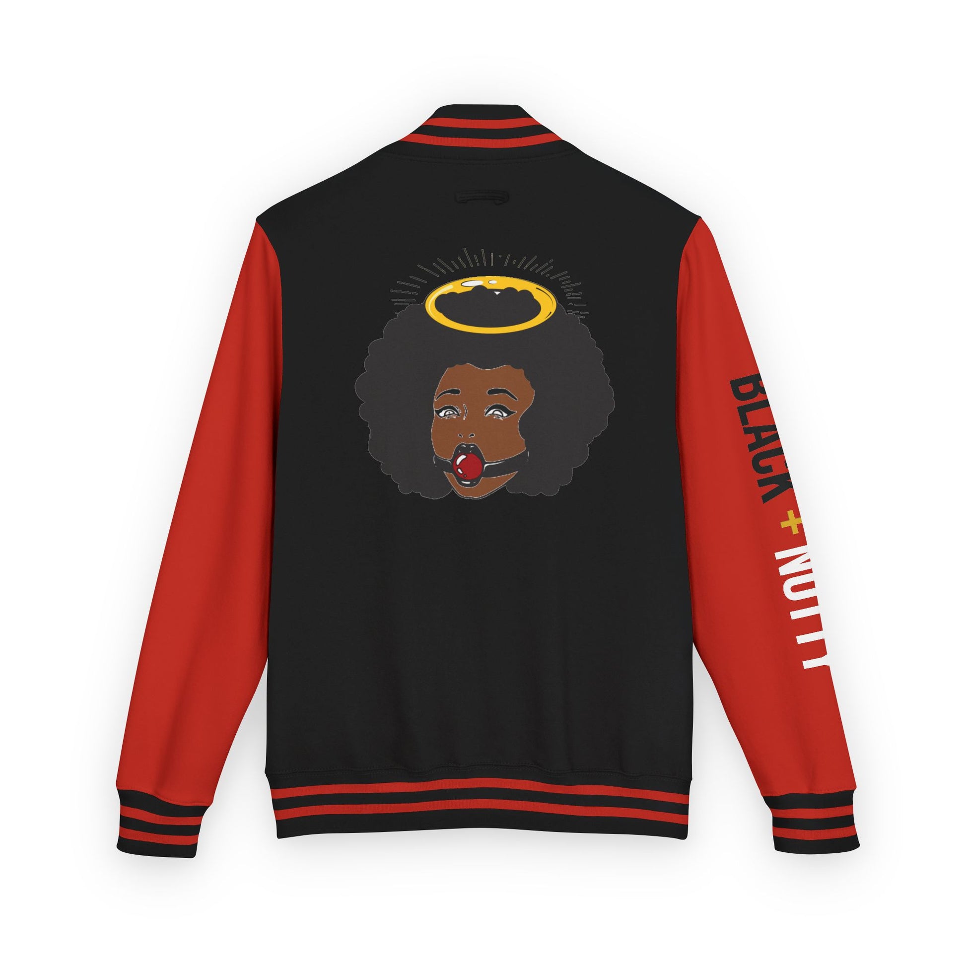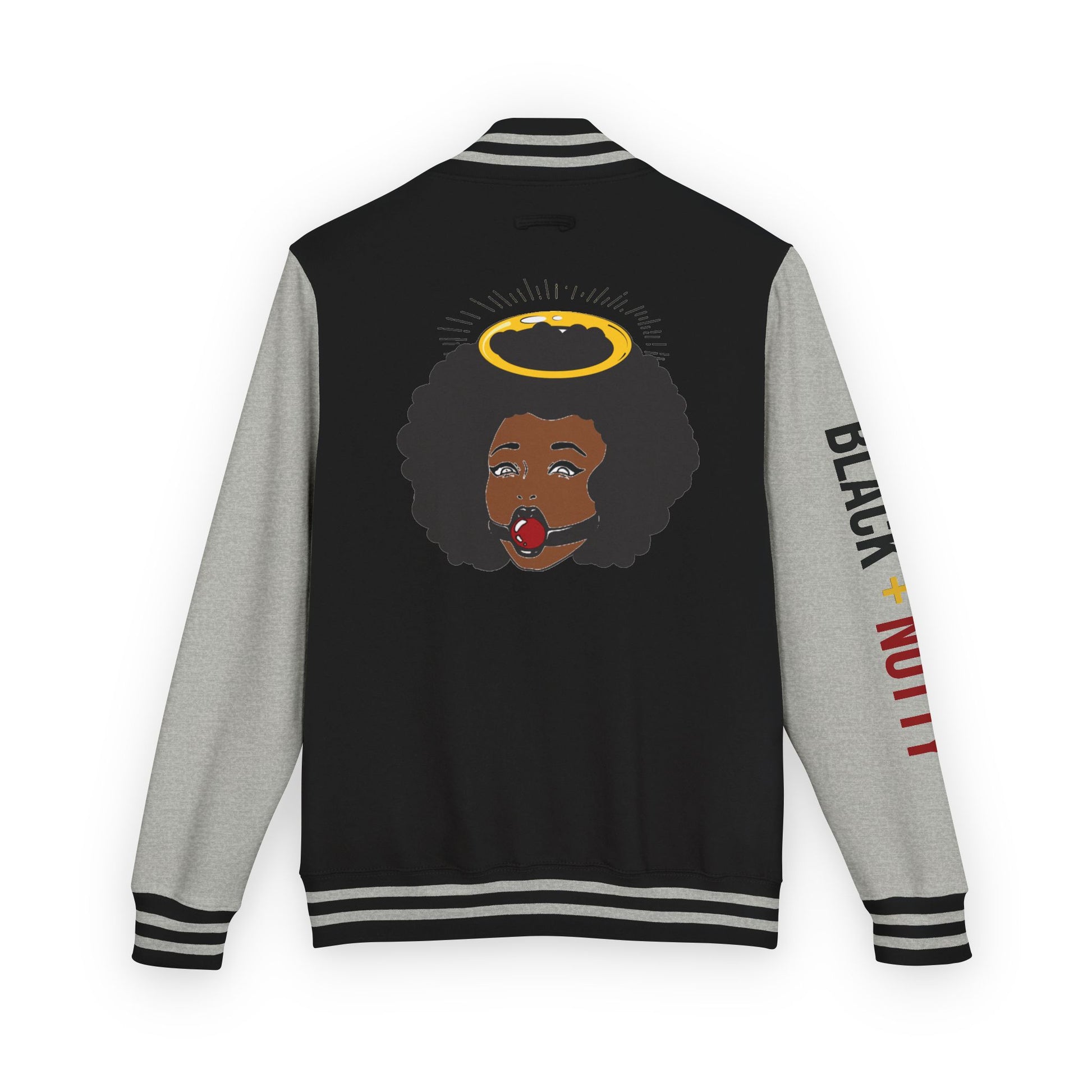 back patch of a halo-crowned, ball-gagged afro goddess, this jacket is more than apparel—it’s a conversation starter. The sleeve print proudly reps BLACK + NOTTY, while the front logo keeps it sleek and stylish.