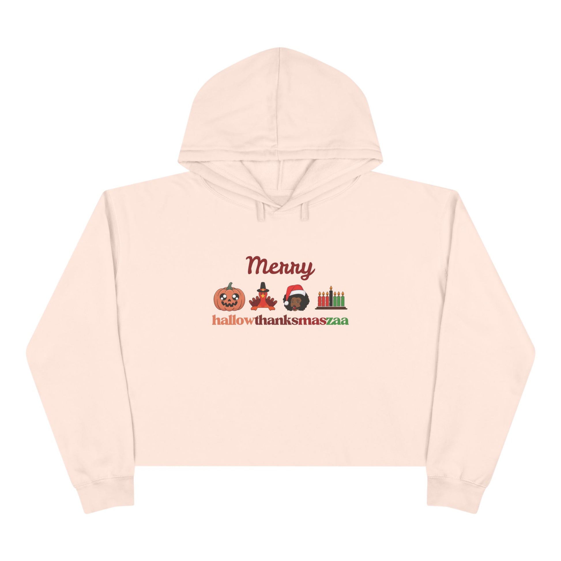A festive Crop Hoodie featuring the unique design 'Merry Hallowthanksmaszaa'. This hoodie exudes a cozy and celebratory vibe, perfect for the holiday season. It is relevant to those who embrace holidays like Halloween, Thanksgiving, Christmas, and Kwanzaa.
