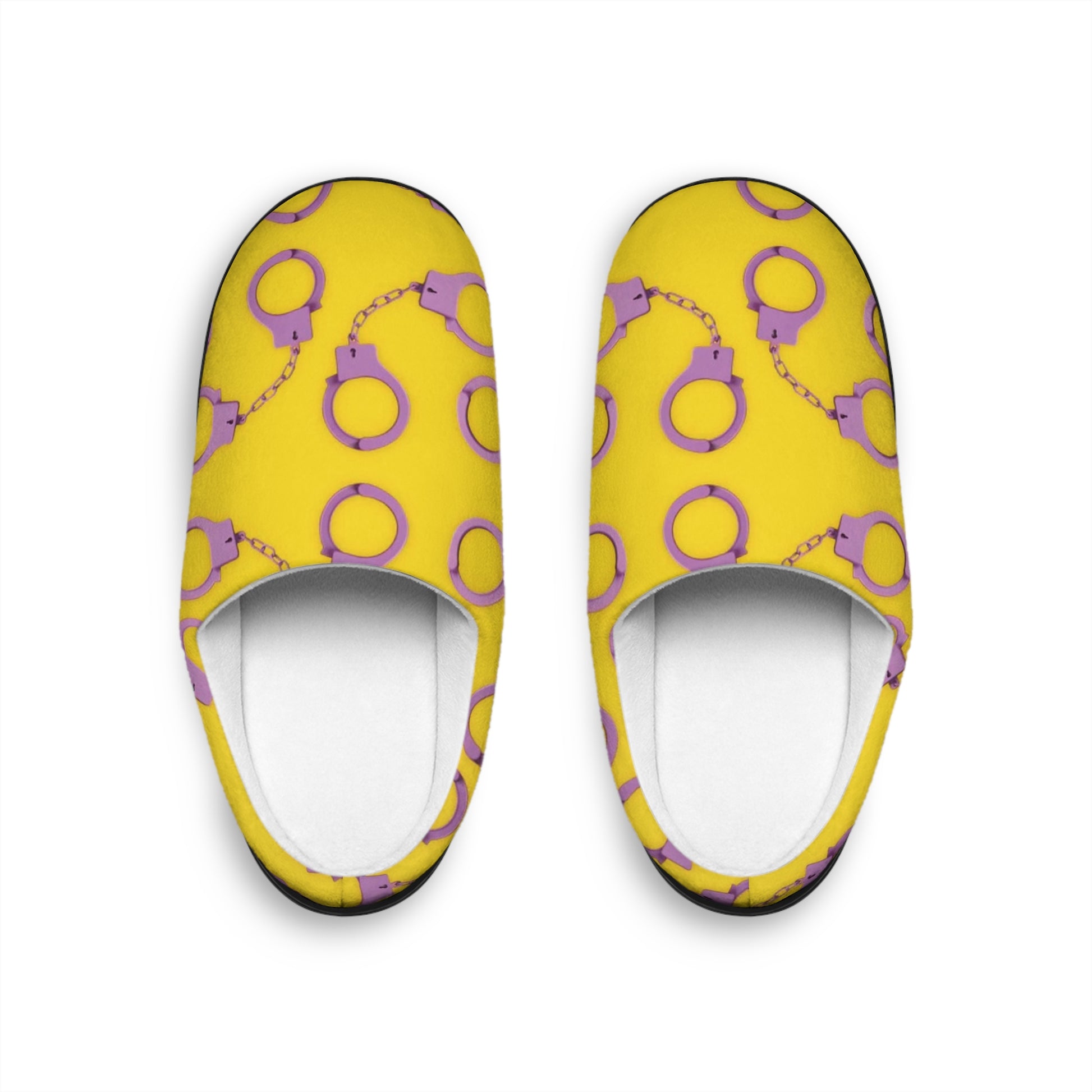 Slip into something a little… naughty and nice. These bold yellow indoor slippers feature an all-over pattern of playful pink handcuffs, making them the perfect statement for kink-friendly lounging. Soft lining, cushioned insoles, and a slip-on fit keep you comfortable, while the cheeky design keeps you unapologetically you.