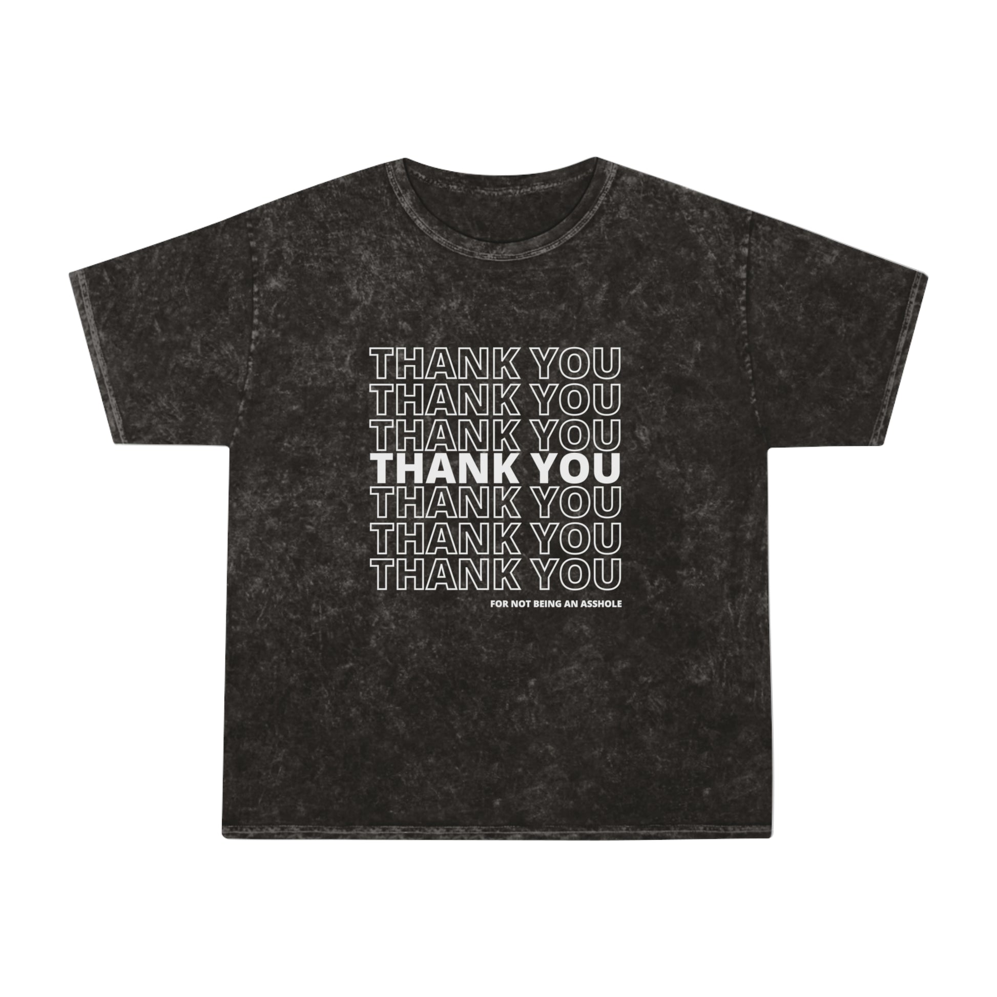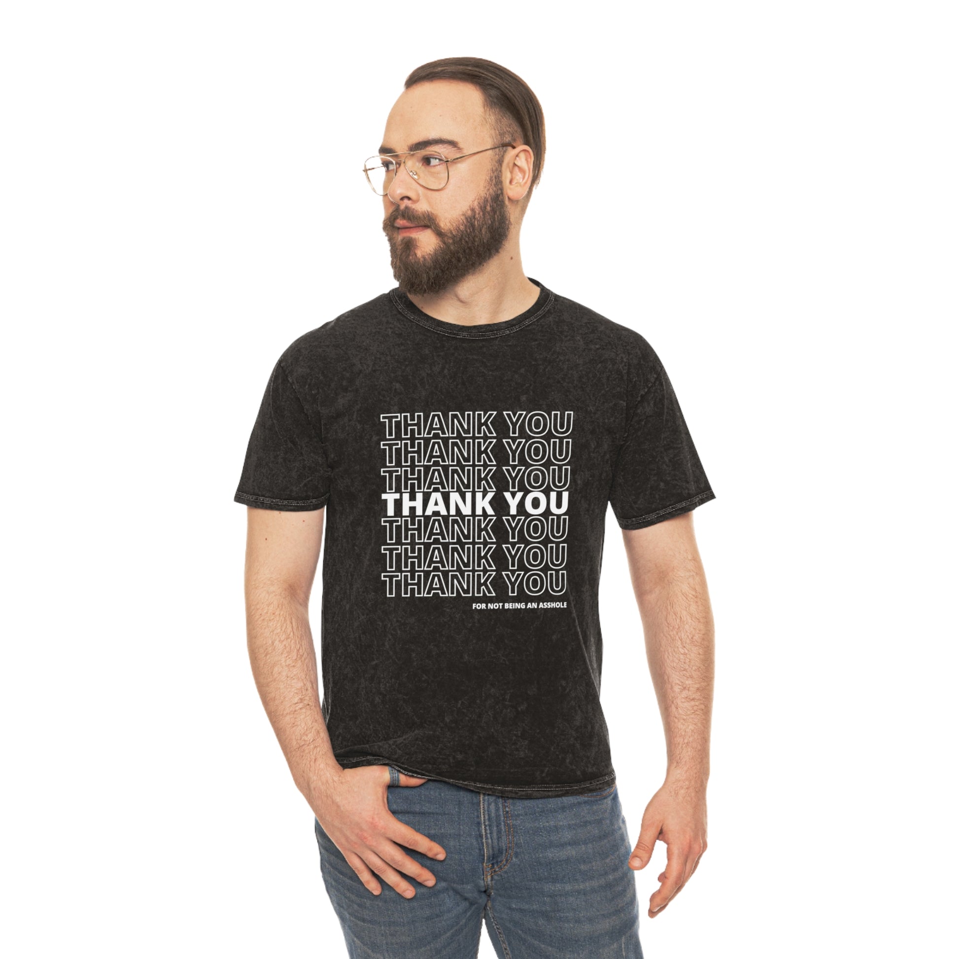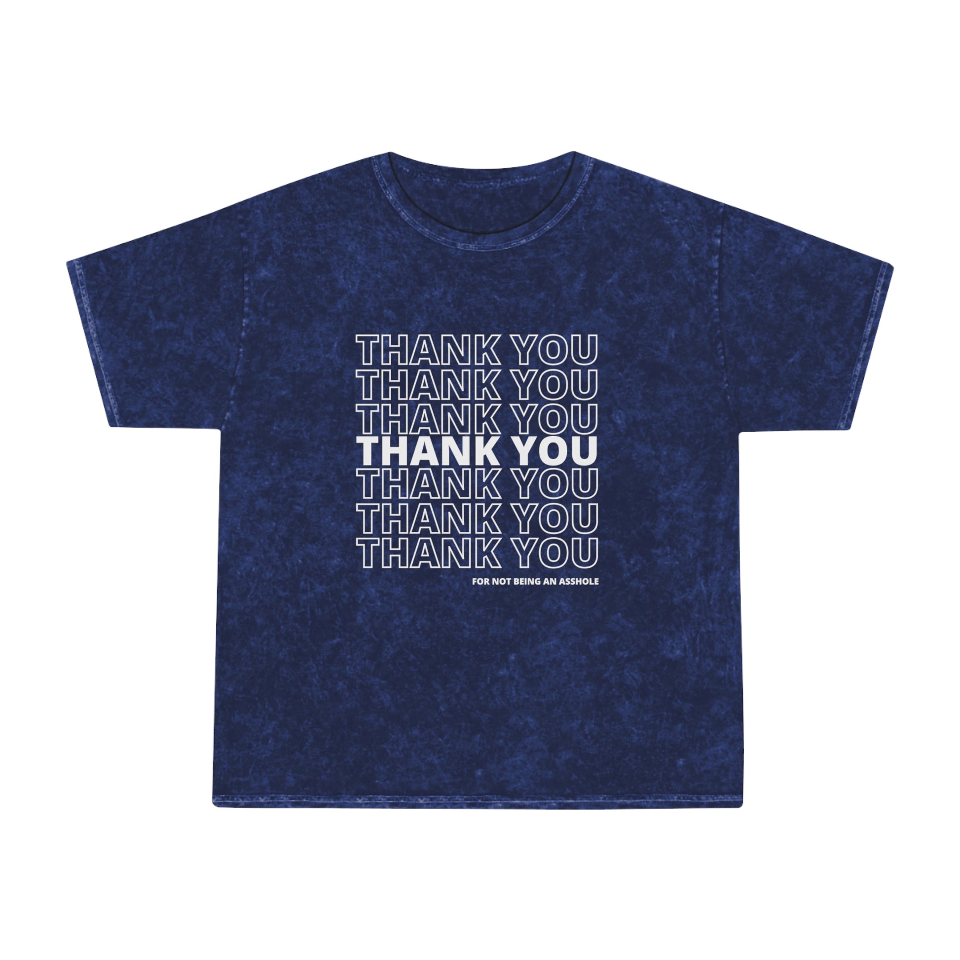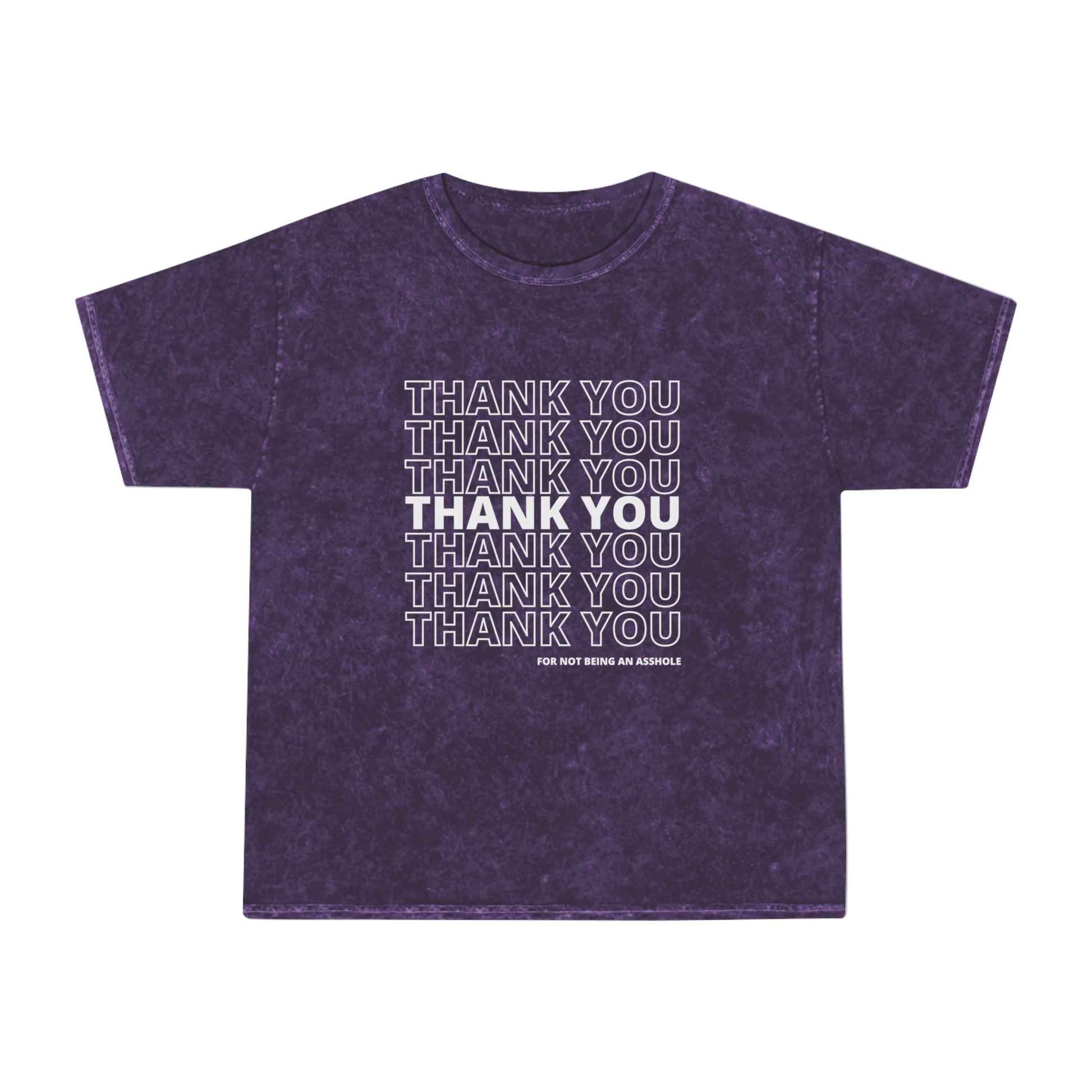 This unisex Mineral Wash T-Shirt features a fun 'Thank you for not being an asshole' design. The vintage look and feel of the mineral wash pattern adds a unique touch to the shirt. Perfect for those with a sense of humor who appreciate a laid-back style. Great for casual wear, gifting to friends or family, or wearing to social gatherings and events.