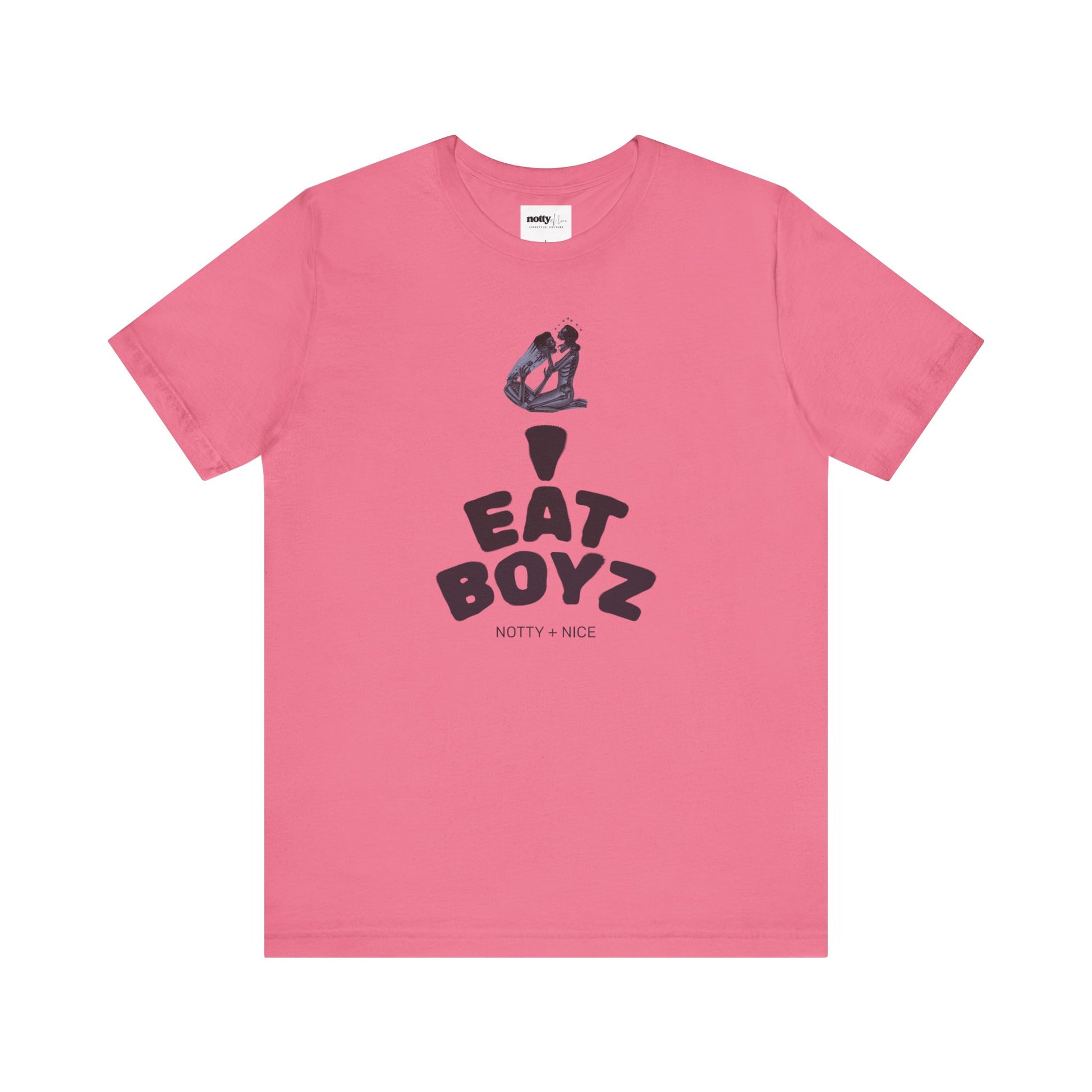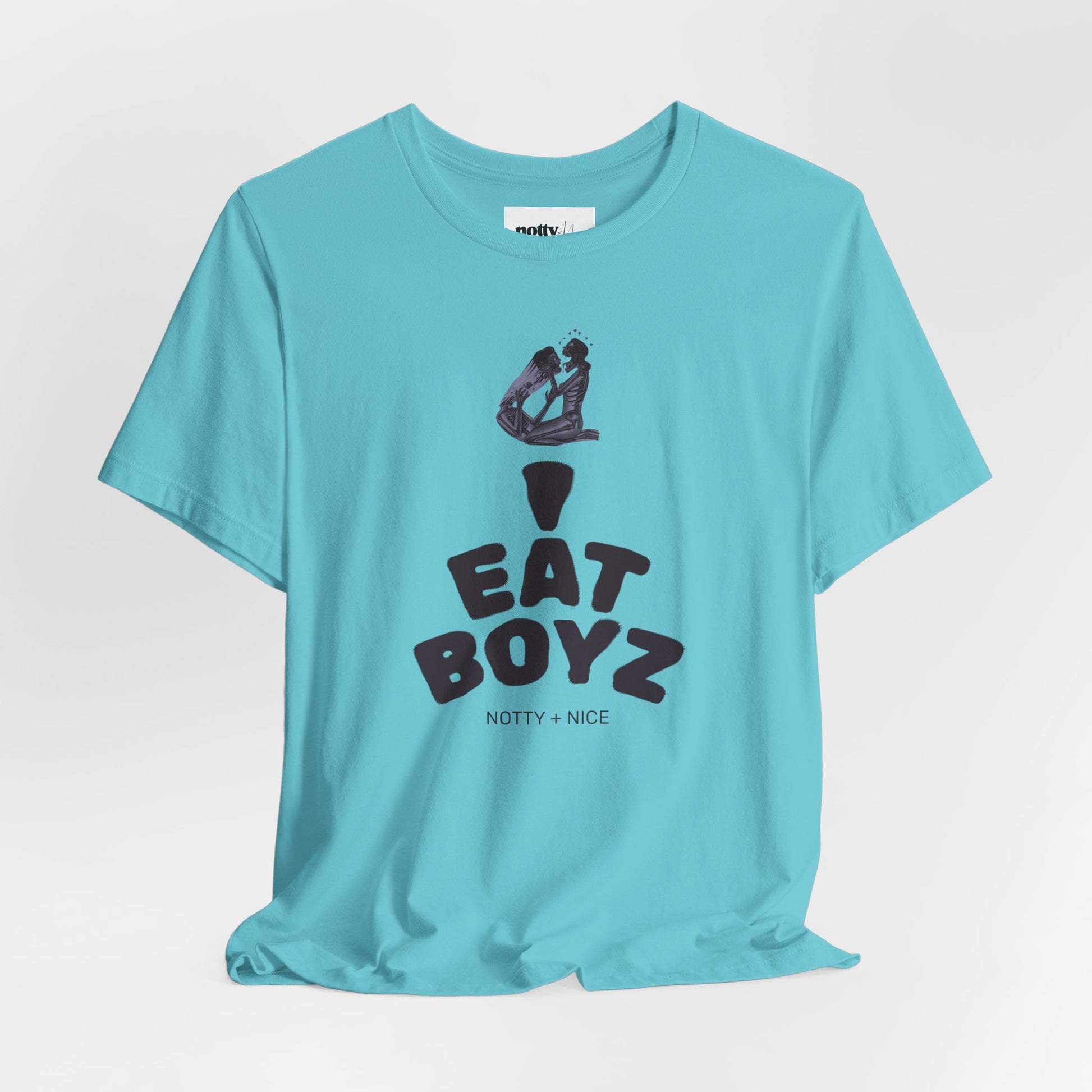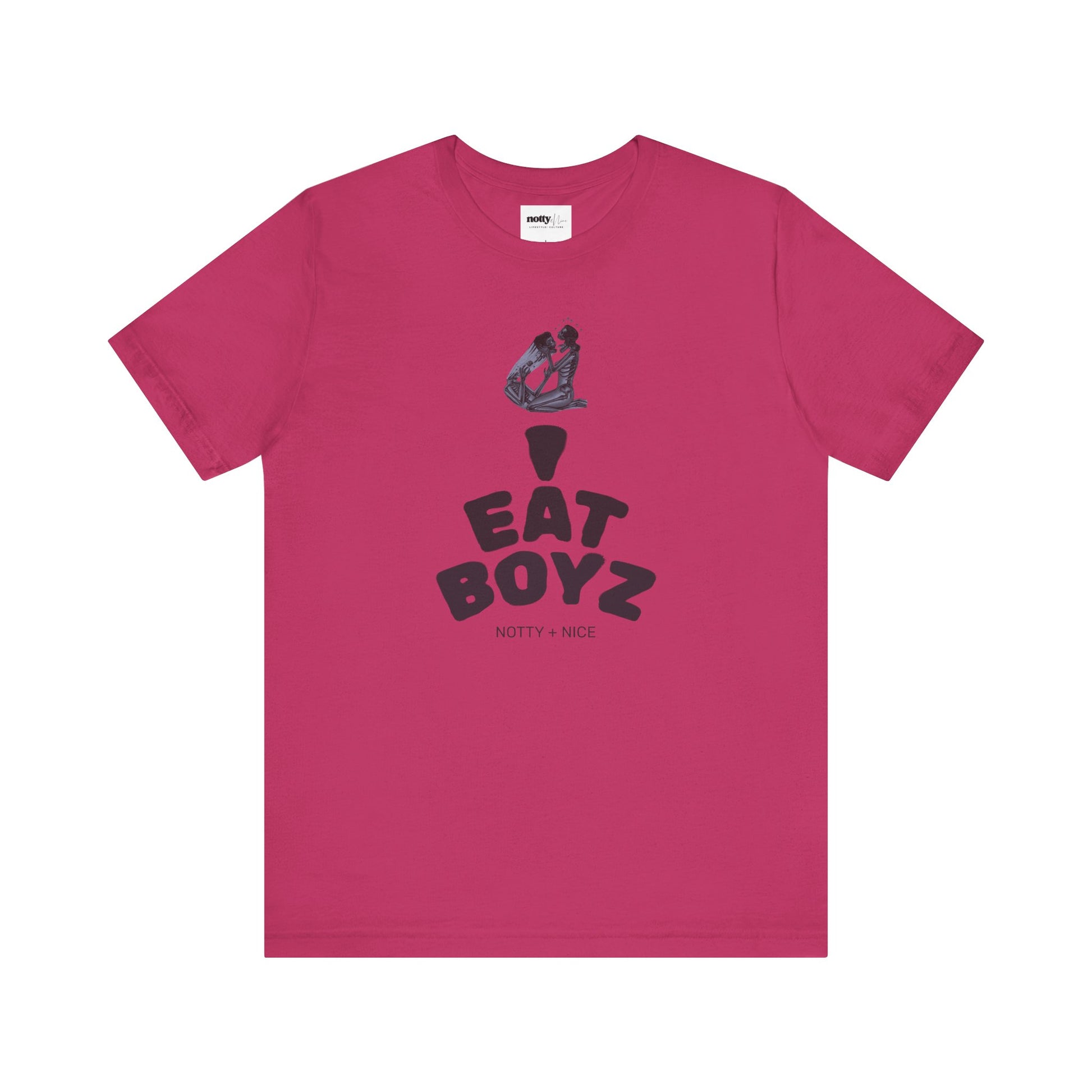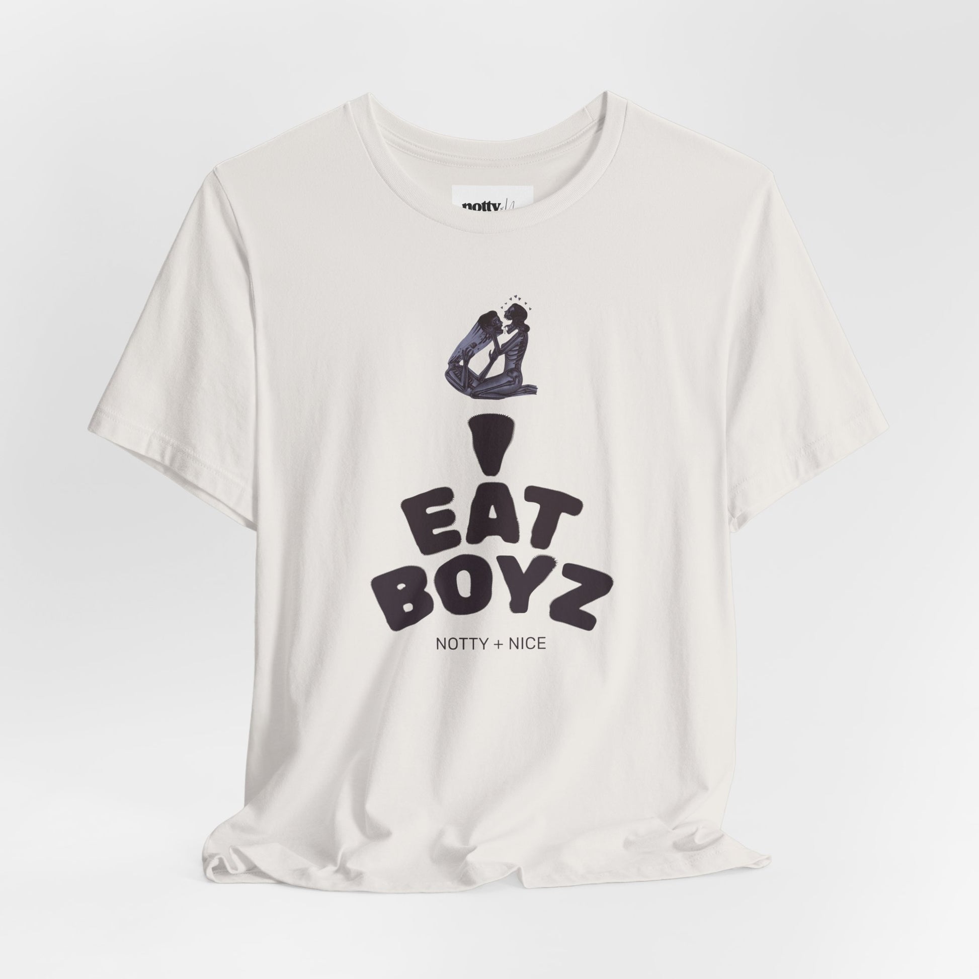 The I Eat Boyz Tee isn’t subtle—and why should it be? With bold curved lettering, a tongue icon, and a suggestive silhouette on top, this tee is dripping in attitude and appetite. It's flirty, filthy, and Notty as hell.