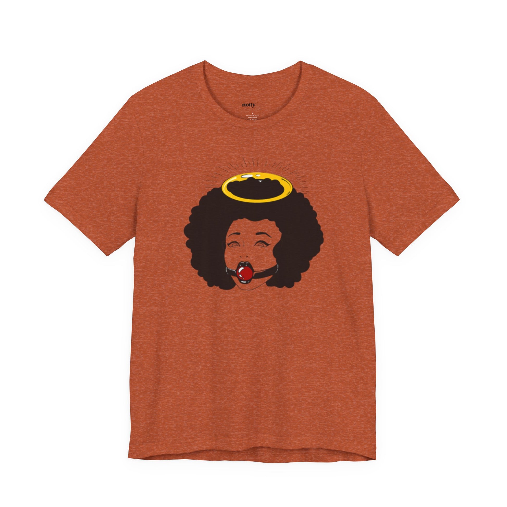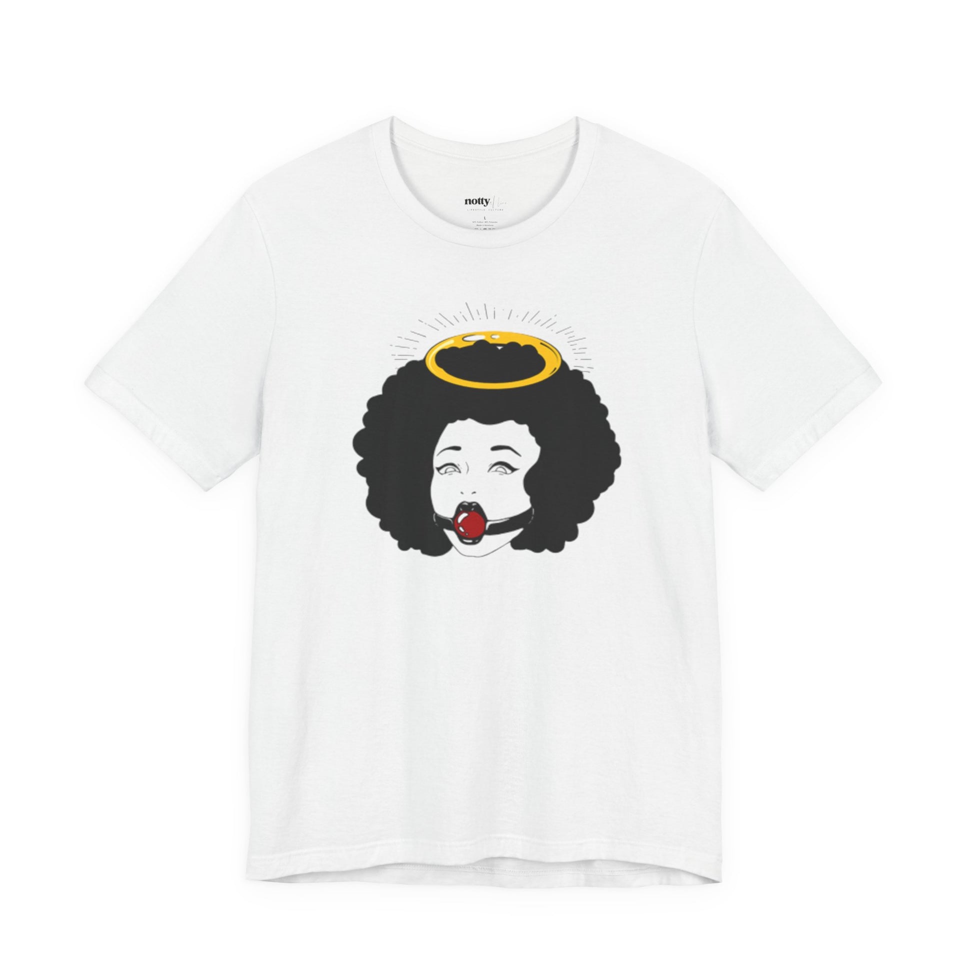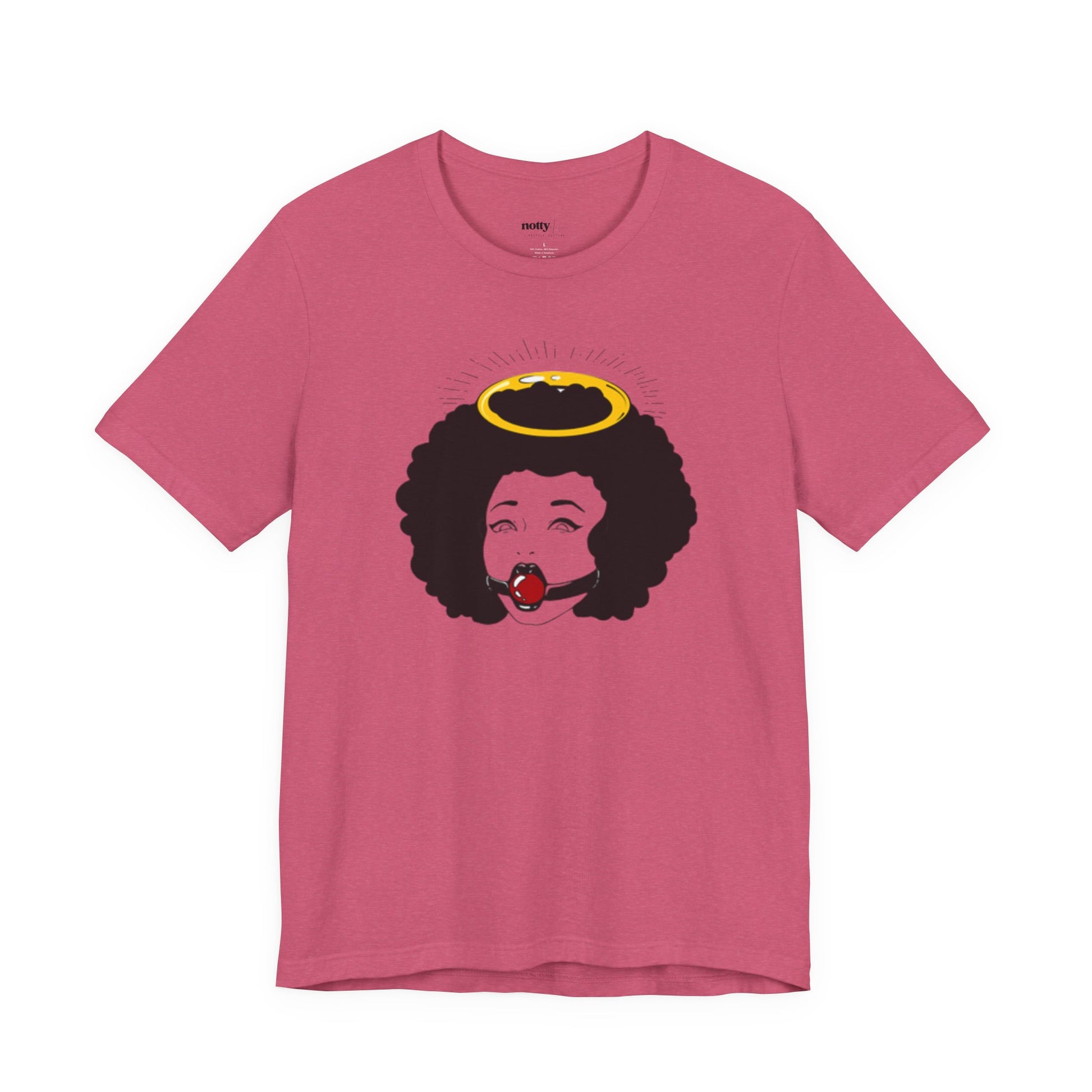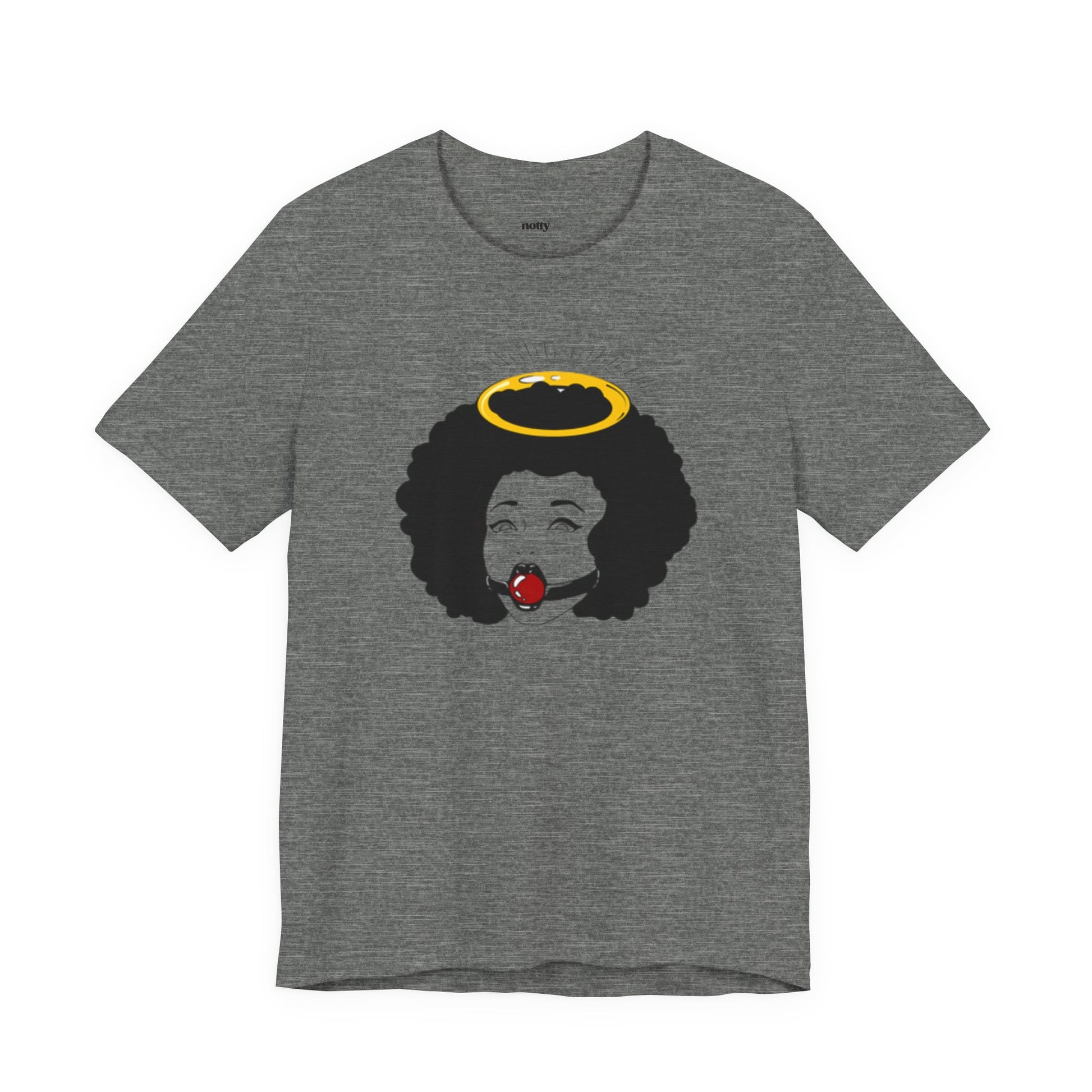 Let your shirt do the talking. The Notty & Nice Halo Tee is bold, playful, and unapologetically Black. Featuring our signature haloed Afro and cheeky ball gag design, this tee is perfect for lifestylers who know how to keep it cute in public and notty in private.