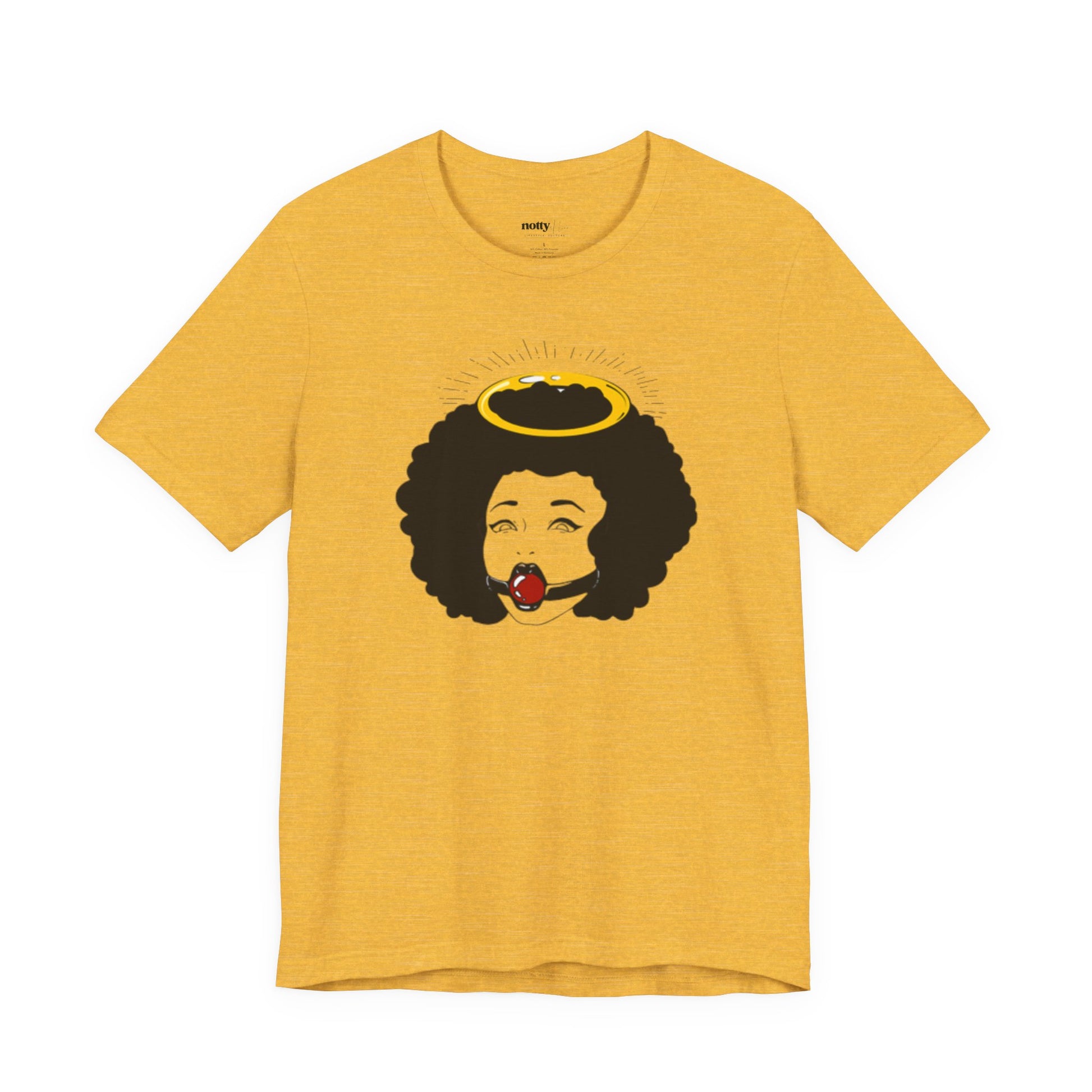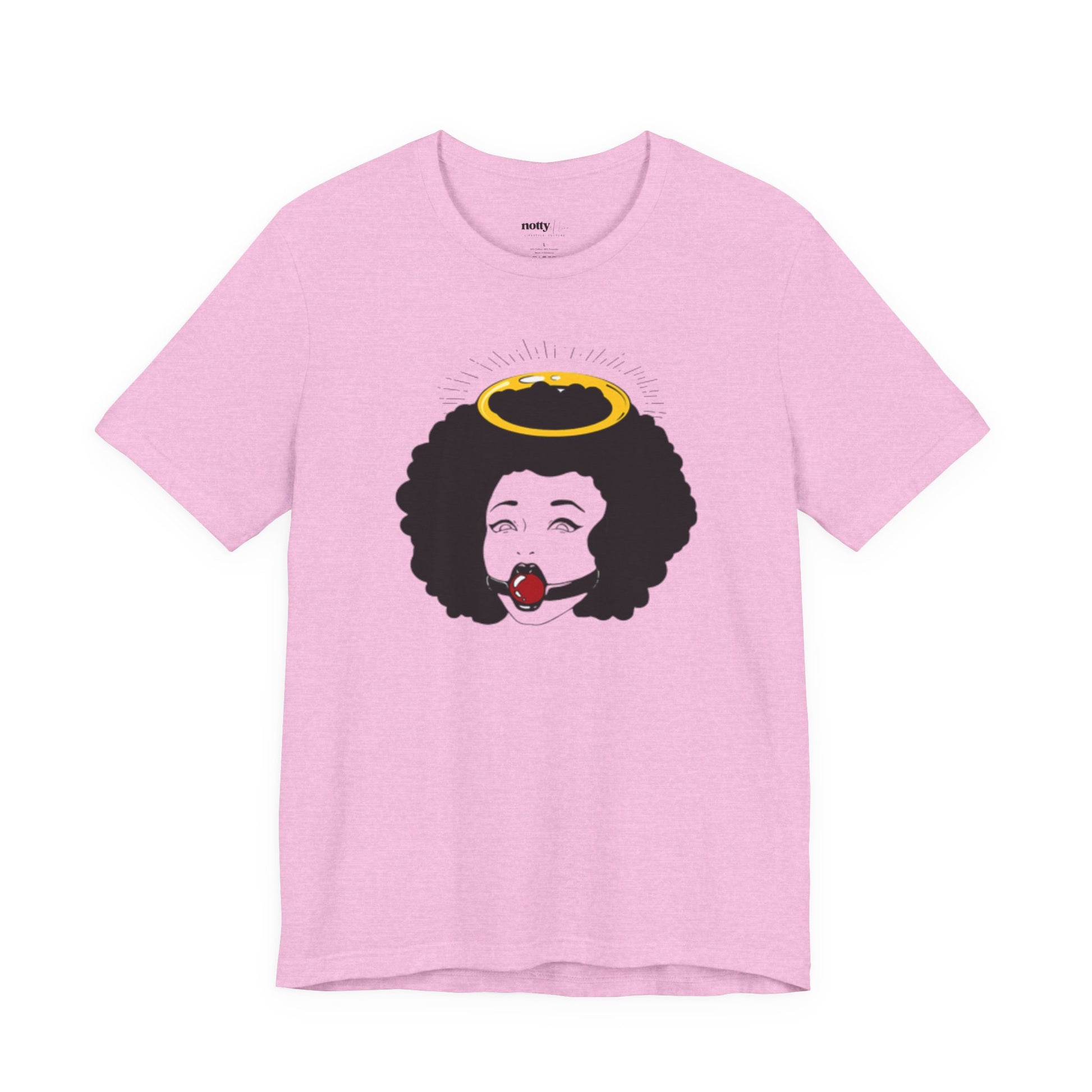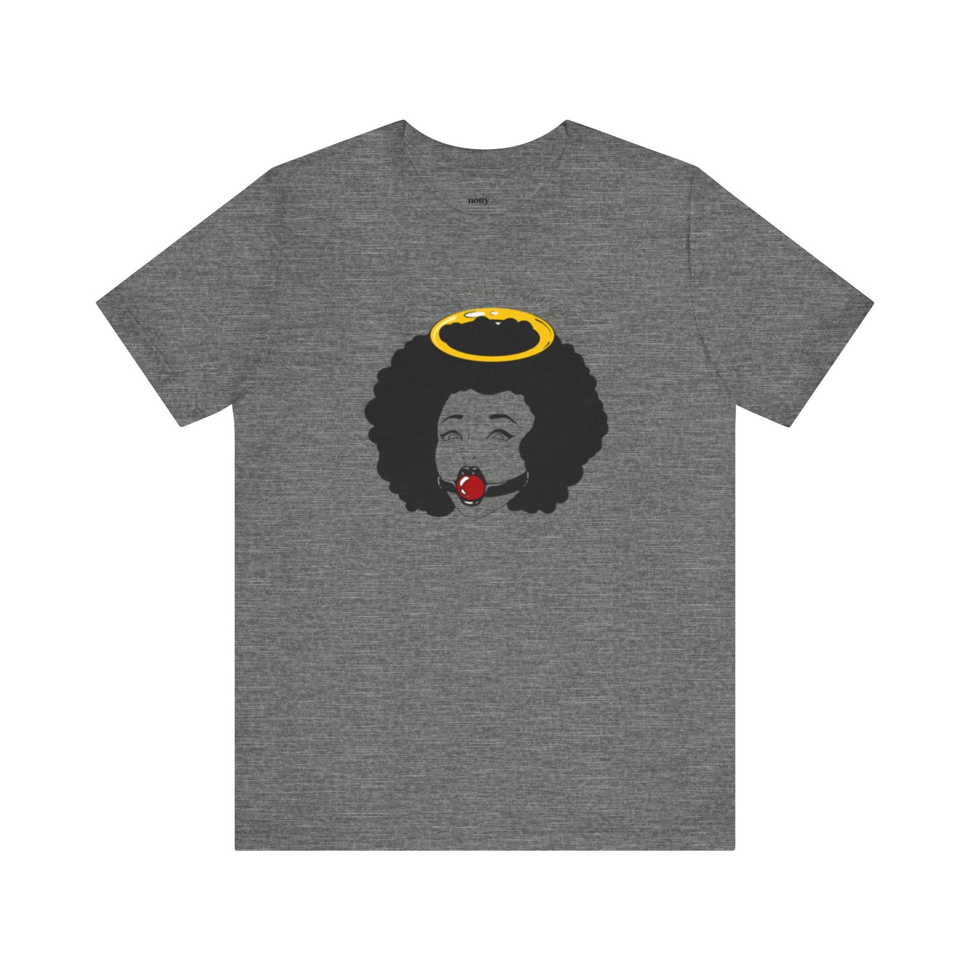 Let your shirt do the talking. The Notty & Nice Halo Tee is bold, playful, and unapologetically Black. Featuring our signature haloed Afro and cheeky ball gag design, this tee is perfect for lifestylers who know how to keep it cute in public and notty in private.